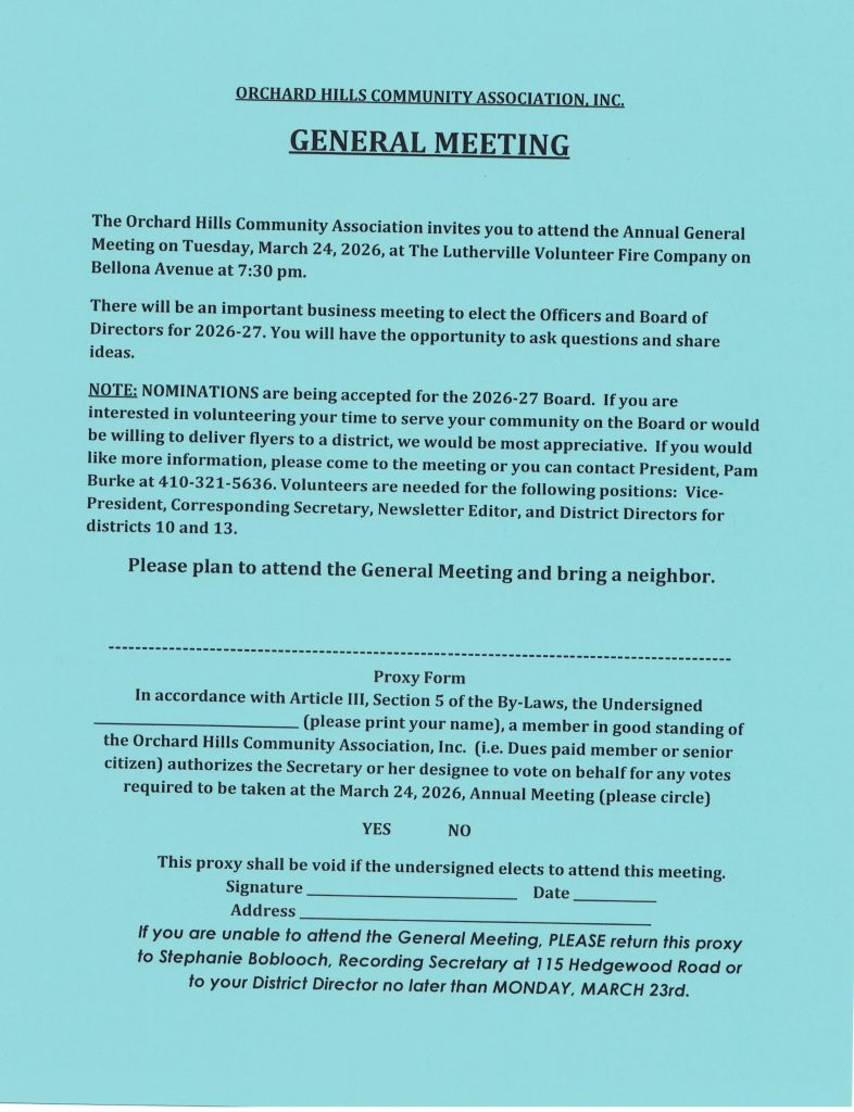 OHCA General Meeting will be held on March 24, 2026 at The Lutherville Volunteer Fire Company on Bellona Ave at 7:30 PM. See the flyer below for more details.